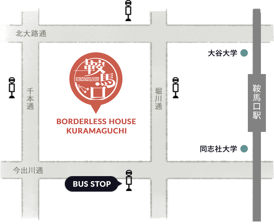 四条、京都駅、円町に繋がるバス停まで徒歩5分。京都の各エリアへ足を運びやすい立地に、ボーダレスハウス京都鞍馬口はあります。さらに地下鉄烏丸線鞍馬口駅までも徒歩圏内なので、京都府内を楽々移動できます。大谷大学や同志社大学への移動もしやすい立地のため、学生さんにもおすすめしたいシェアハウスです。