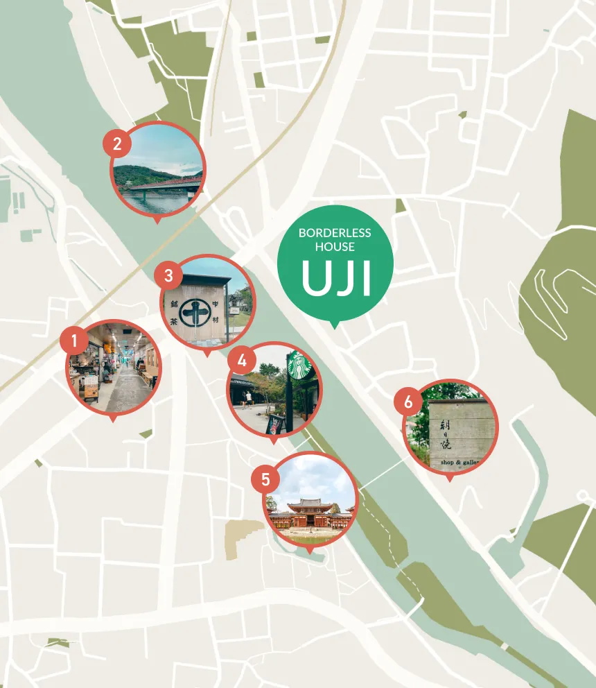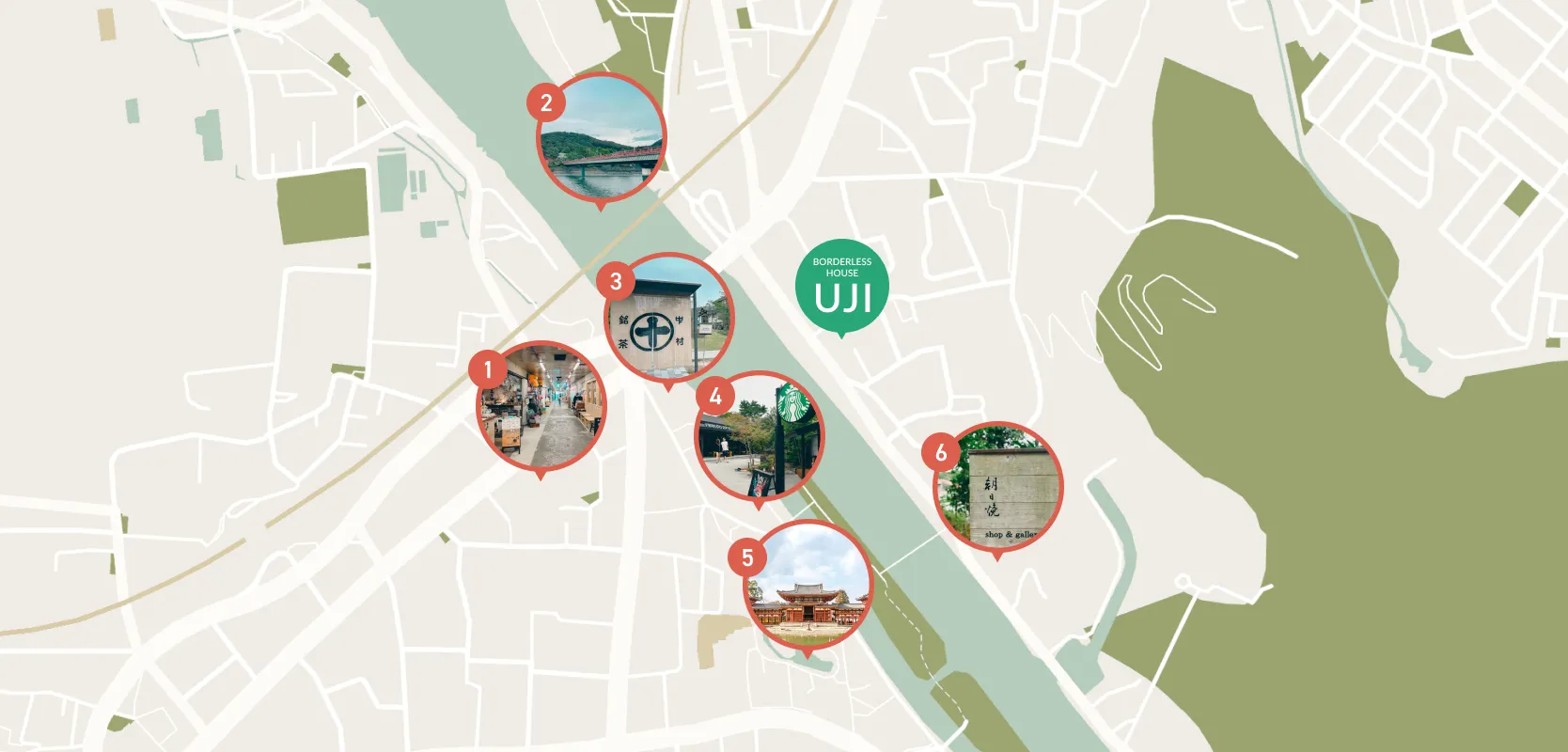 自然溢れる宇治川や、昔ながらの街並みが残るシェアハウス周辺には、世界遺産の平等院鳳凰堂など伝統的な建造物や、地元の商店街やカフェなど生活に便利なお店も立ち並びます。ハウスメイトと一緒にお出かけして、周辺を散策してみましょう。