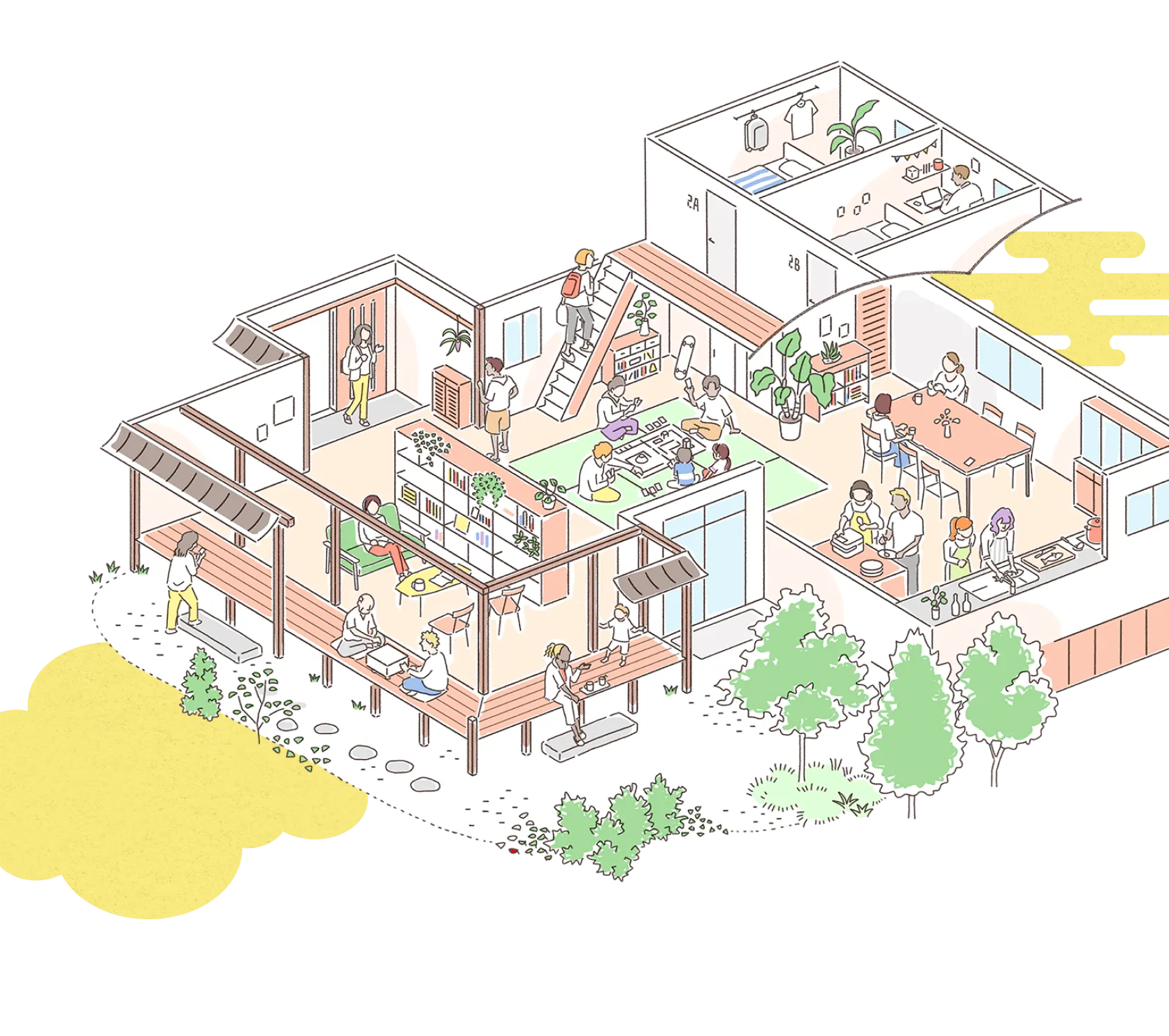 【特徴は、広さにこだわったリビングや居室。縁側でハウスメイトと交流も】