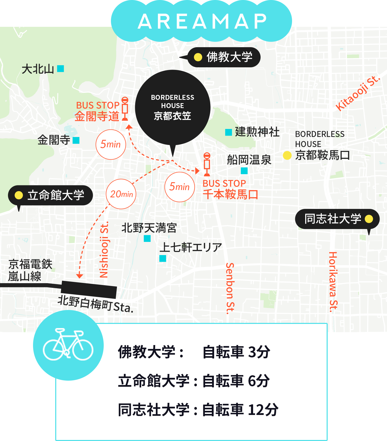 立命館大学(約5分)、同志社大学(約10分)、佛教大学(約3分)と、近隣大学へ自転車で通学ができるため、通学に時間をかけたくない学生にオススメです。