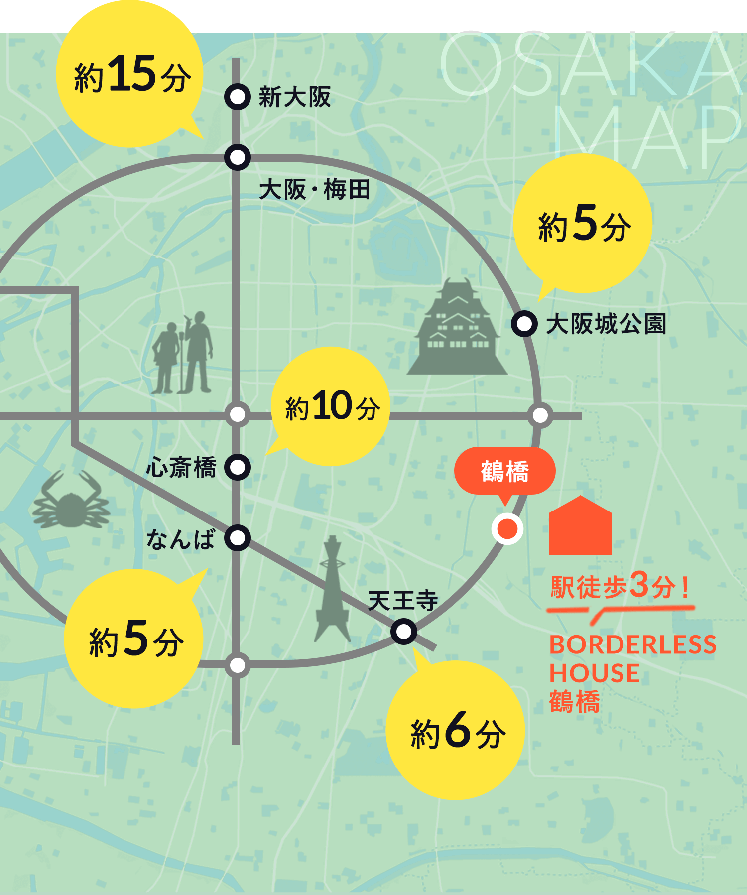 ボーダレスハウス大阪鶴橋1の最寄駅は、その名のとおり鶴橋駅。JR大阪環状線、大阪メトロ千日前線、近鉄線が通る便利な駅なので、なんばや天王寺までは10分以内、大阪駅までも15分でアクセスできちゃいます!また、近鉄線を利用すれば、奈良県・三重県などへも遊びに行けるので、少し足を伸ばして観光を楽しむにも最適ですよ。