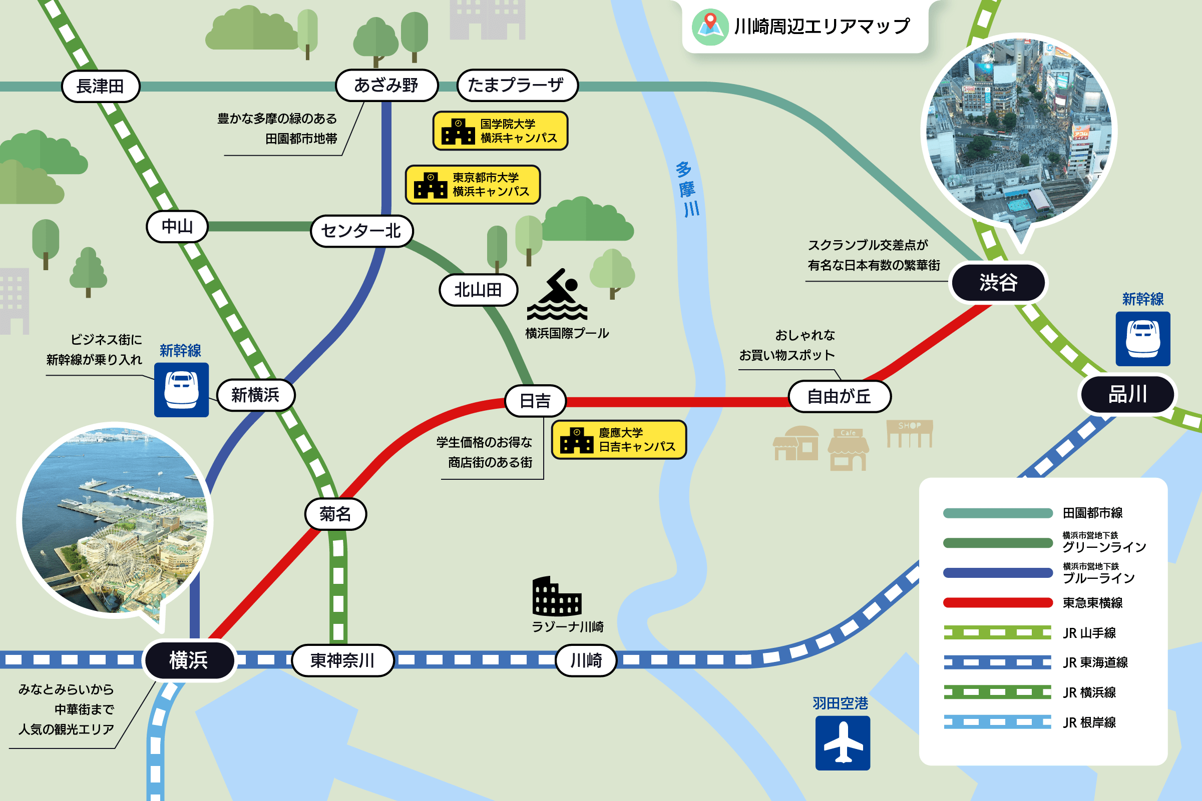 大学のキャンパスが近く、学生の街の印象が強い日吉駅。商店街があって日常生活もしやすく、実は大人でも住みやすい街です。東横線渋谷駅まで約30分、都心までのアクセスも良く、特に20代~30代に人気です。