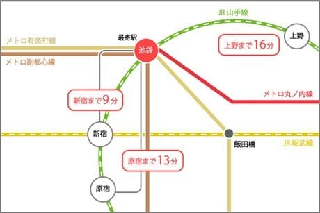 東京メトロ有楽町線・副都心線・丸ノ内線・埼京線、JR山手線・JR新宿湘南ライン、西武池袋線、東武東上線と、なんと主要路線8線が利用可能。