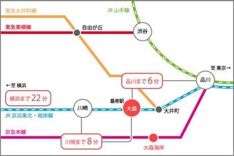JR大森駅から10分ほど歩くと、京浜急行線大森海岸駅もあります。京浜急行線沿いに通勤、通学する方にとっても大森エリアはとても便利ですね。